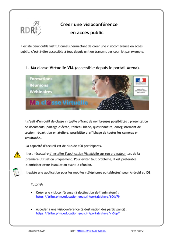 Classe virtuelle VIA outil institutionnel accessible aux enseignants sur le portail Arena